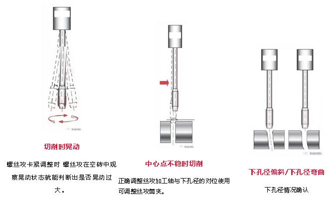 沿著孔徑方向而做多余切削就會發(fā)生內(nèi)螺紋擴(kuò)大,沿著偏斜下孔徑進(jìn)行攻牙內(nèi)螺紋上方有擴(kuò)孔的情形。