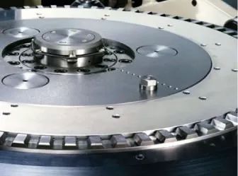 YASDA的工作臺(tái)夾緊機(jī)構(gòu)由120?175mm厚的優(yōu)質(zhì)鑄鐵制成的高剛性工作臺(tái)以及YASDA傳統(tǒng)的夾緊構(gòu)造系統(tǒng)構(gòu)成。該系統(tǒng)采用弧齒聯(lián)軸節(jié)盤定位工作臺(tái)于底盤,通過聯(lián)軸節(jié)盤圓周上帶30°壓力角的弧齒以無齒隙咬合實(shí)現(xiàn)工作臺(tái)高精度定位。工作臺(tái)與底盤的結(jié)構(gòu)一體化結(jié)構(gòu),保證高剛性?shī)A緊,良好的振動(dòng)衰減性。同時(shí)具有工作臺(tái)交換的高重復(fù)定位精度,實(shí)現(xiàn)長(zhǎng)時(shí)間的無人高精度加工。