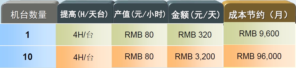 10臺(tái)設(shè)備一年理論上所提高的產(chǎn)值96,000*12= RMB 1,152,000