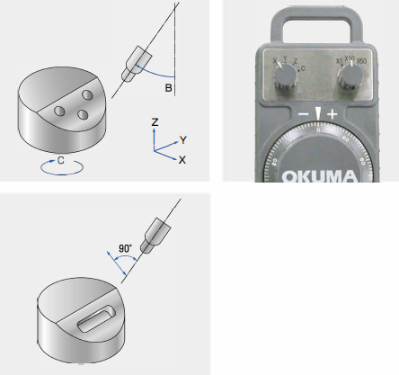 在傾斜刀具主軸的狀態(tài)下, 在軸方向以及軸上沿直角的方向可以進(jìn)行手輪進(jìn)給。 利用該功能通過(guò)脈沖手輪可以簡(jiǎn)單地進(jìn)行在傾斜面上開(kāi)孔, 退刀或傾斜面的平面加工。