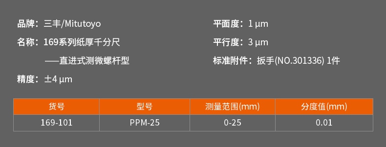思誠資源為您提供:Mitutoyo三豐 169系列 PPM-B 直進(jìn)式紙厚千分尺的采購報價、Mitutoyo(三豐)169系列型號參數(shù)、規(guī)格圖片、PDF畫冊等資料,如您想了解更多關(guān)于Mitutoyo(三豐)正品品牌的其他千分尺資料與產(chǎn)品貨期庫存、行情價格,就在思誠資源MRO商城。