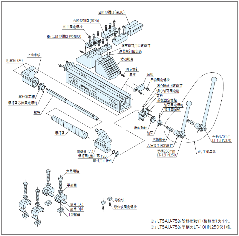 ![]() | 臺階型鉗口(格柵型)LT5AU-100SJG-8(6個1組)·····1組 臺階型鉗口(深20)LT5AU-100SJ-20(2片1組)·····1組 臺階型鉗口(深30)LT5AU-100SJ-30(2片1組)·····1組 標(biāo)準(zhǔn)安裝夾具套裝 BCS18Q1(2組1套)·····2套 標(biāo)準(zhǔn)導(dǎo)位塊 LT18-18(2個1組)·····1組 標(biāo)準(zhǔn)手柄 LT-13HN250,LT-13HN370······1根 |